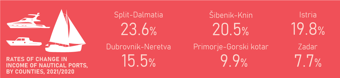 The total income generated by nautical ports in 2021 amounted to 946 million kuna, which was 16.5% more than in 2020. All maritime counties generated an increase in total income of nautical ports in 2021 compared to 2020.
