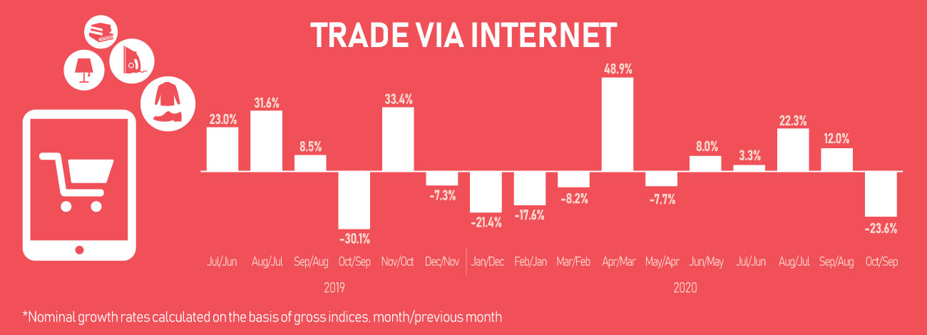 In October 2020, as compared to the previous month, the turnover of retail sale via Internet decreased by 23.6%.