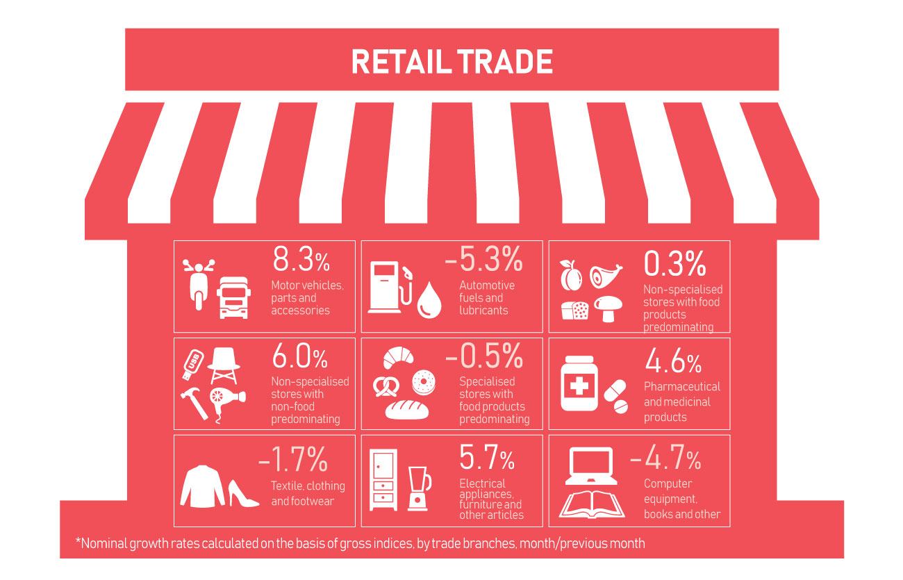 In October 2020, as compared to the previous month, according to gross, unadjusted indices, there was an increase in turnover in six trade branches, while other trade branches recorded a decrease. The largest increase in turnover was realised in the following trade branches: Other non-store retail sale, of 12.3%, and Motor vehicles, parts and accessories for motor vehicles, motorcycles and related parts and accessories, of 8.3%, while the largest decrease in turnover was recorded in trade branch Retail sale via Internet or via mail order, of 23.6%.