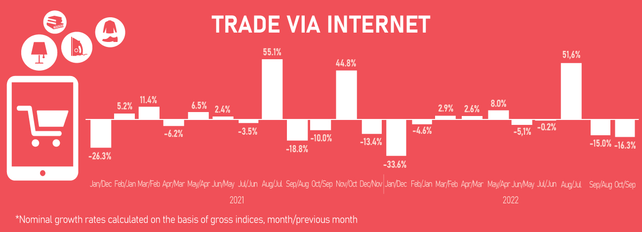 In October 2022, as compared to the previous month, the turnover of retail sale via Internet decreased by 16.3%.