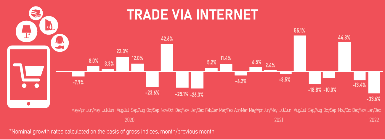 In January 2022, as compared to the previous month, the turnover of retail sale via Internet decreased by 33.6%.