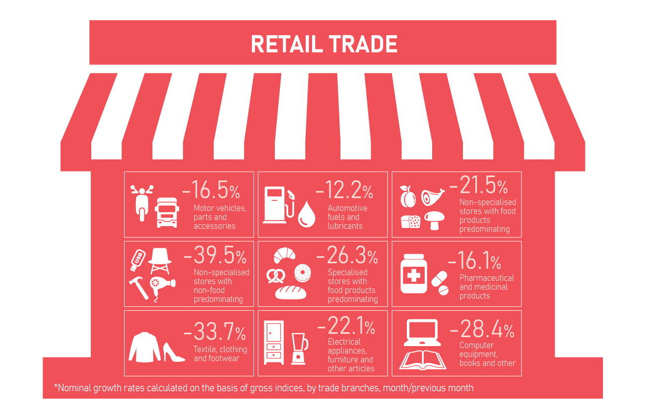In January 2022, as compared to the previous month, according to gross, unadjusted indices, all trade branches had a decrease in turnover. The largest decrease in turnover was recorded in trade branches Other non-specialised stores (of 39.5%), Textile, clothing and footwear (of 33.7%) and Retail sale via Internet or via mail order (of 33.6%).