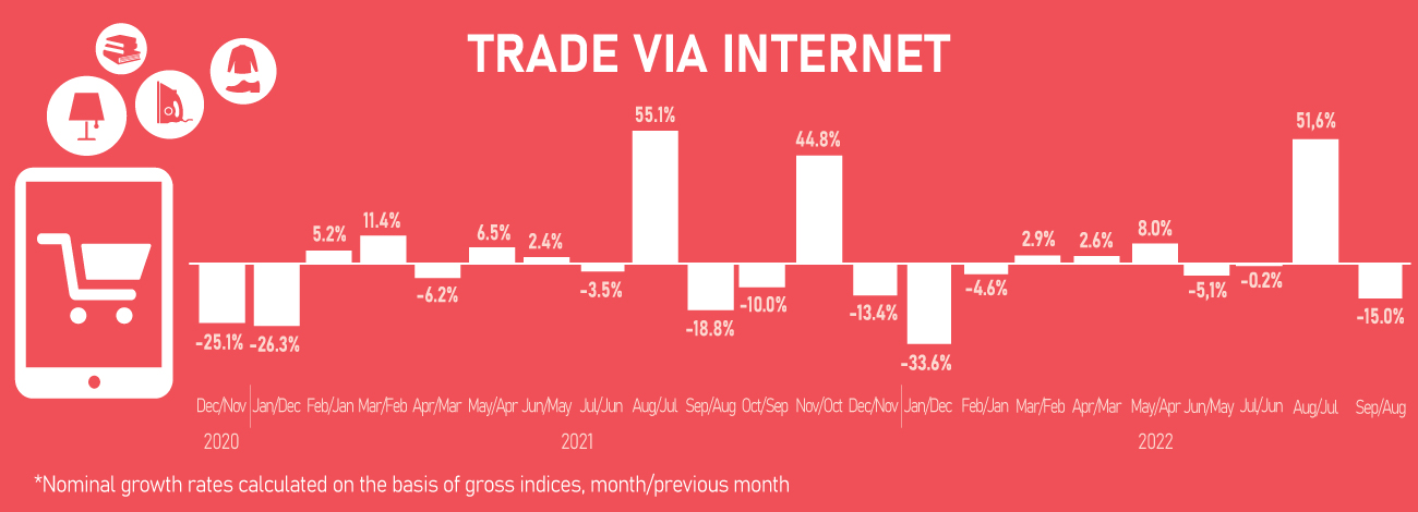 In September 2022, as compared to the previous month, the turnover of retail sale via Internet decreased by 15.0%.