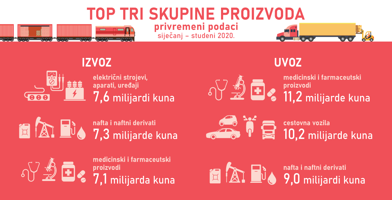 Promatrajući ukupan izvoz Republike Hrvatske u prvih jedanaest mjeseci 2020., najviše je izvezeno električnih strojeva, aparata i uređaja, u vrijednosti od 7,6 milijardi kuna, nafte i naftnih derivata u vrijednosti od 7,3 milijarde kuna, te medicinskih i farmaceutskih proizvoda, u vrijednosti od 7,1 milijarde kuna.