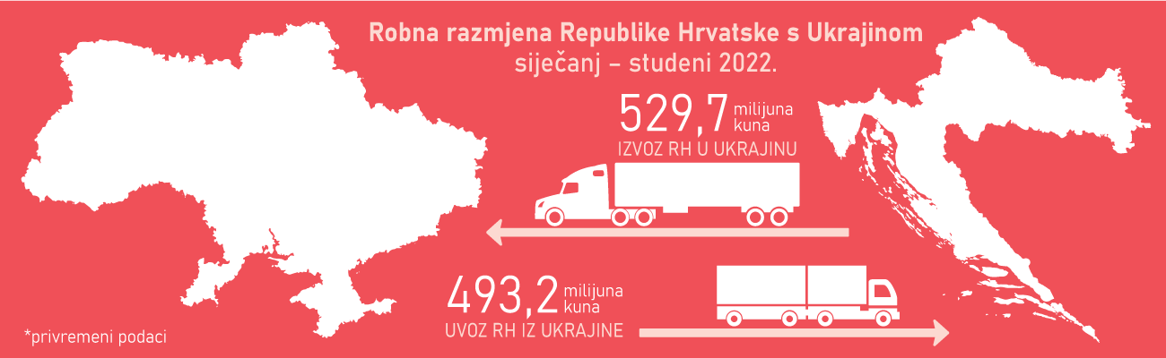 Ukupan izvoz Republike Hrvatske od siječnja do studenoga 2022., prema privremenim podacima, iznosio je 166,1 milijardu kuna i veći je za 40,6 milijardi kuna ili 32,3% u usporedbi s istim razdobljem 2021. Ukupan uvoz Republike Hrvatske iznosio je 288,3 milijarde kuna, što je porast od 94,5 milijardi kuna, odnosno 48,8% u odnosu na isto razdoblje 2021.