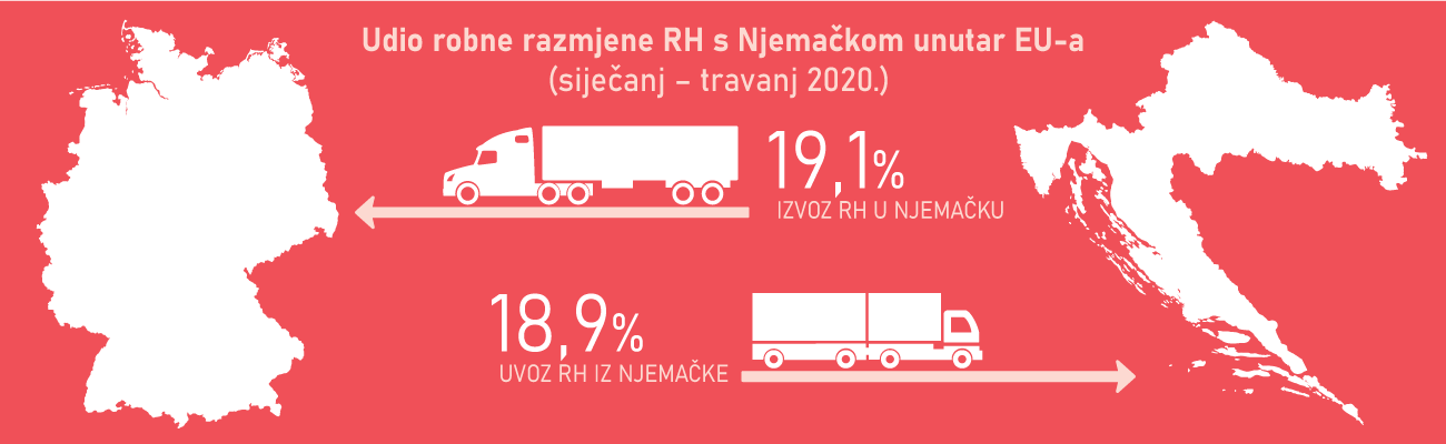 Najvažniji vanjskotrgovinski partner Republike Hrvatske u ukupnoj robnoj razmjeni u 2019. bila je Njemačka, s kojom je ostvareno 13,2% ukupne vrijednosti izvoza roba te 15,5% ukupne vrijednosti uvoza roba. Ako promatramo robnu razmjenu unutar Europske unije, izvoz u Njemačku u 2019. iznosio je 19,3%, a uvoz iz Njemačke 19,2%. U razdoblju od siječnja do travnja 2020. vrijednost roba koje je Republika Hrvatska izvezla u Njemačku, u odnosu na robnu razmjenu unutar Europske unije, iznosila je 19,1%, dok je uvoz Republike Hrvatske iz Njemačke iznosio 18,9%.