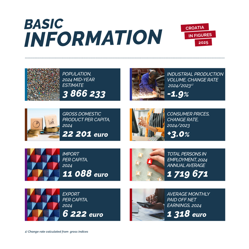 Croatia in Figures is an annual publication of the Croatian Bureau of Statistics that provides an overview of selected statistical indicators from 24 different statistical areas. Given that we are continuously working to improve and modernise the process of dissemination of statistical data, we have once again prepared a digital version of this publication, focusing on a more modern and visually appealing presentation that will allow the data to be more easily understood and interpreted.