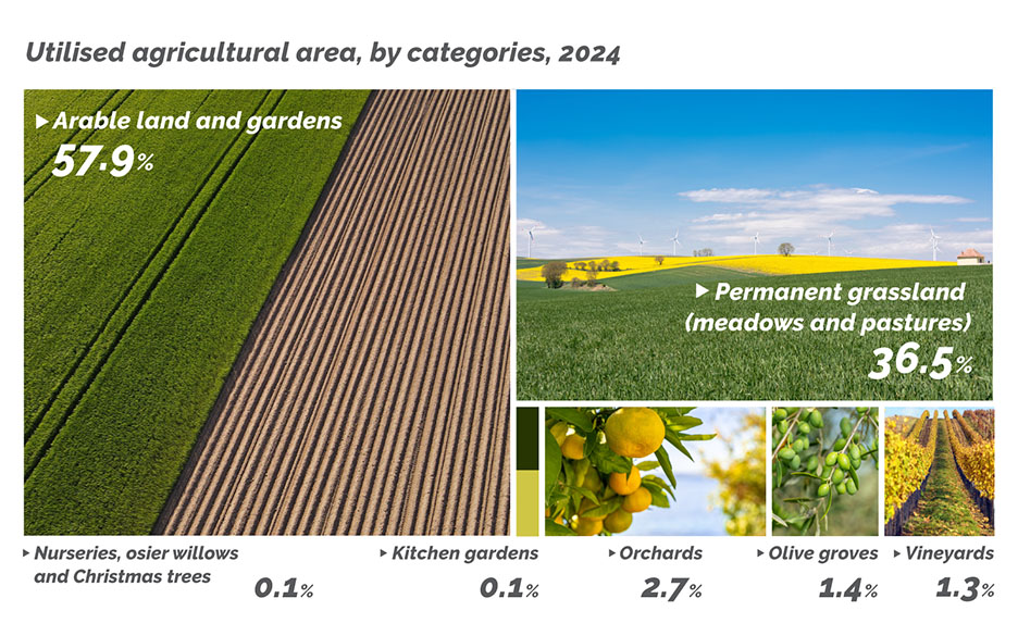 Available agricultural land is the basis for all agricultural activities. More than half of the agricultural land in 2024 was arable land and gardens, while more than a third were permanent grasslands.