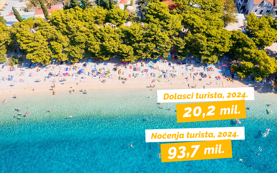 U 2024. u komercijalnim smještajnim objektima ostvareno je 93,7 milijuna noćenja turista, što je za 1,4% više nego u 2023.