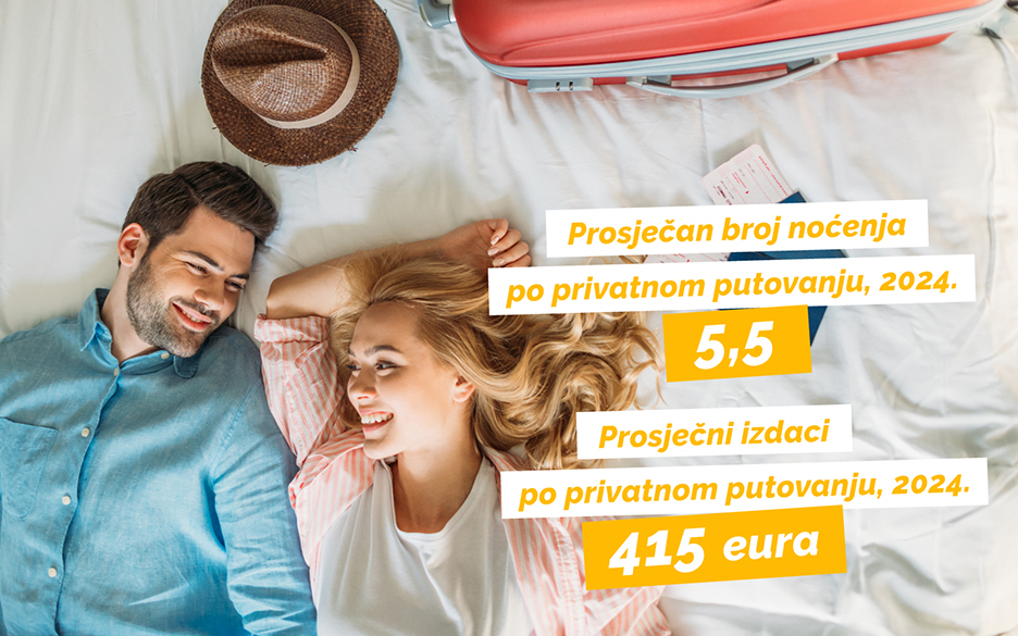Stanovnici Hrvatske u dobi od 15 i više godina ostvarili su u 2024. ukupno 5,5 milijuna privatnih višednevnih putovanja, a od toga 65,6% u Hrvatskoj, a 34,4% u stranim zemljama. Na privatnim višednevnim putovanjima u 2024. stanovnici Hrvatske u dobi od 15 i više godina ostvarili su ukupno 30,1 milijun noćenja, od toga 20,2 milijuna noćenja (67,2%) na putovanjima u Hrvatskoj, a 9,9 milijuna (32,8%) na putovanjima u strane zemlje.