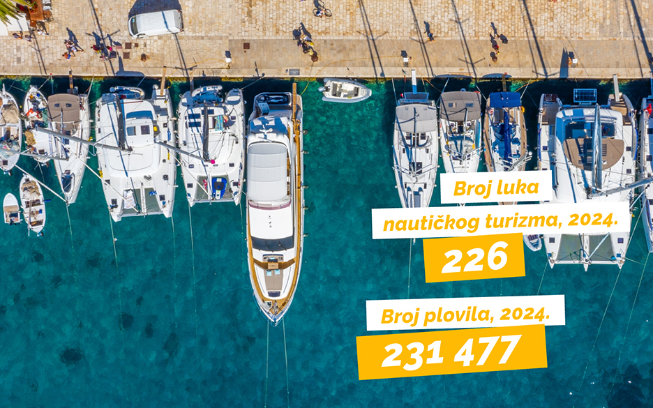 U 2024. na morskoj obali Hrvatske poslovalo je 226 luka nautičkog turizma, među kojima je bilo 85 marina. Ukupna površina njihova akvatorija iznosila je 4 949 829 m2 s 19 073 veza. U lukama nautičkog turizma u 2024. bilo je ukupno 231 477 plovila, što je u odnosu na 2023. pad za 3,9%.